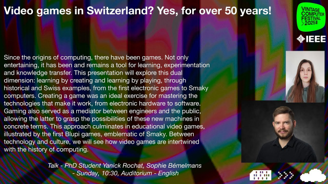 Since the origins of computing, there have been games. Not only entertaining, it has been and remains a tool for learning, experimentation and knowledge transfer. This presentation will explore this dual dimension: learning by creating and learning by playing, through historical and Swiss examples, from the first electronic games to Smaky computers. Creating a game was an ideal exercise for mastering the technologies that make it work, from electronic hardware to software. Gaming also served as a mediator between engineers and the public, allowing the latter to grasp the possibilities of these new machines in concrete terms. This approach culminates in educational video games, illustrated by the first Blupi games, emblematic of Smaky. Between technology and culture, we will see how video games are intertwined with the history of computing. Held by: Prof. Yannick Rochat & PhD Student Sophie Bémelmans