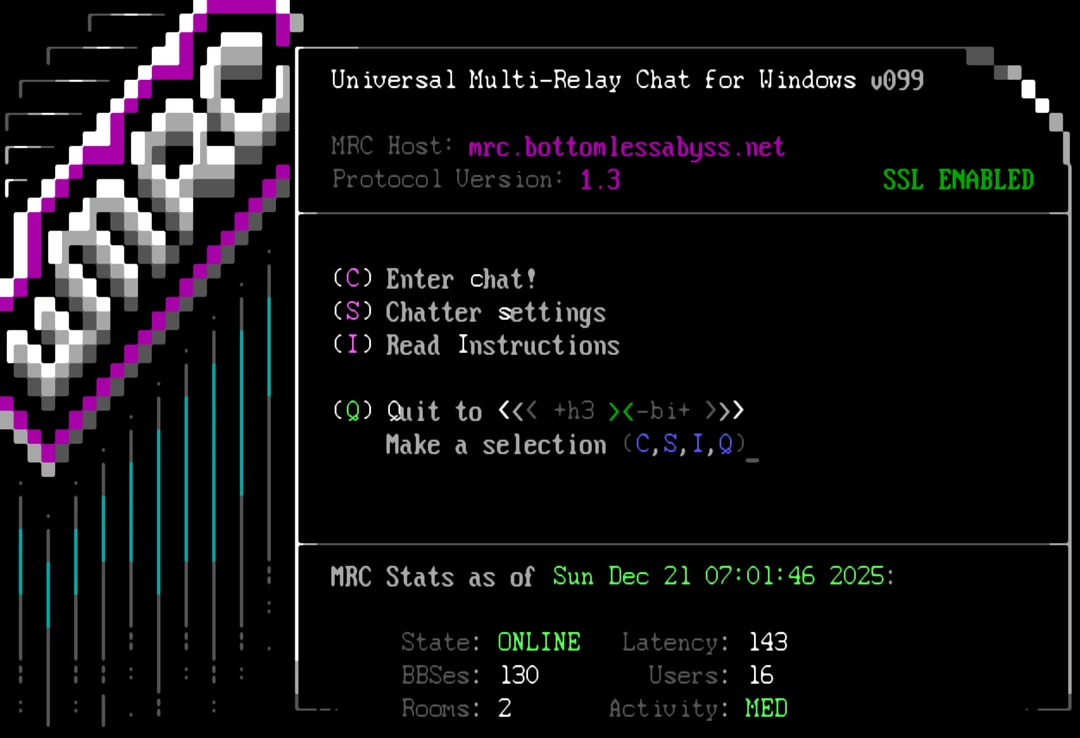 With uMRC this chatuniverse is opening up more. It was online accessible if the BBS was running the Mystic BBS Software. With uMRC any system that can execute Windows 32 programms can add the chatclient as a door to the BBS.